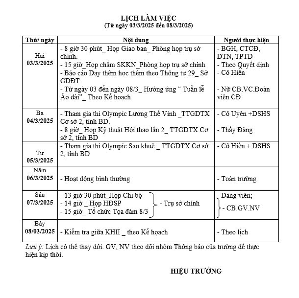 Lịch làm việc Tuần 26, từ ngày 03/3/2025 đến ngày 08/3/2025