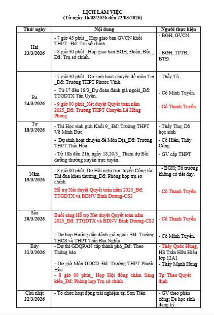 Ghi chú: Lịch làm việc Tuần 26  từ ngày 16/3/2026 đến ngày 22/3/2026