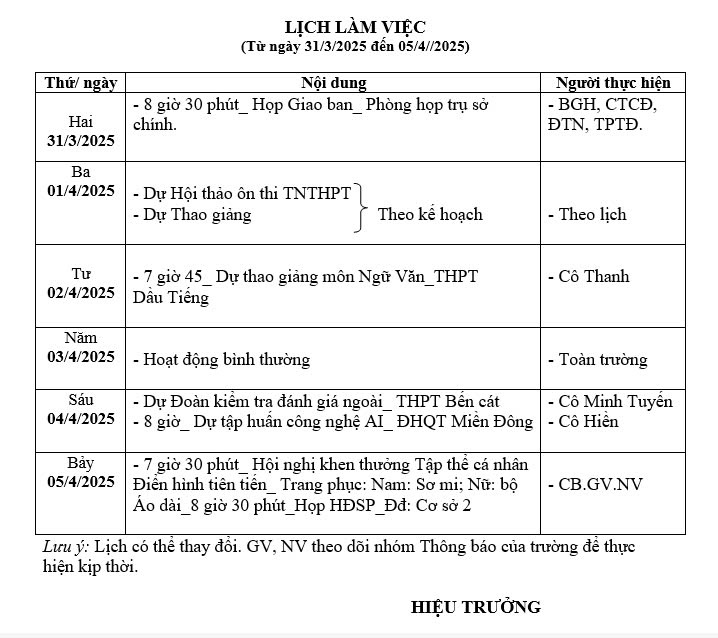Lịch làm việc Tuần 30, từ ngày 31/3/2025 đến ngày 05/4/2025
