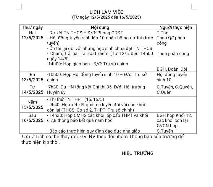 Lịch làm việc Tuần 36, từ ngày 12/5/2025 đến ngày 16/5/2025