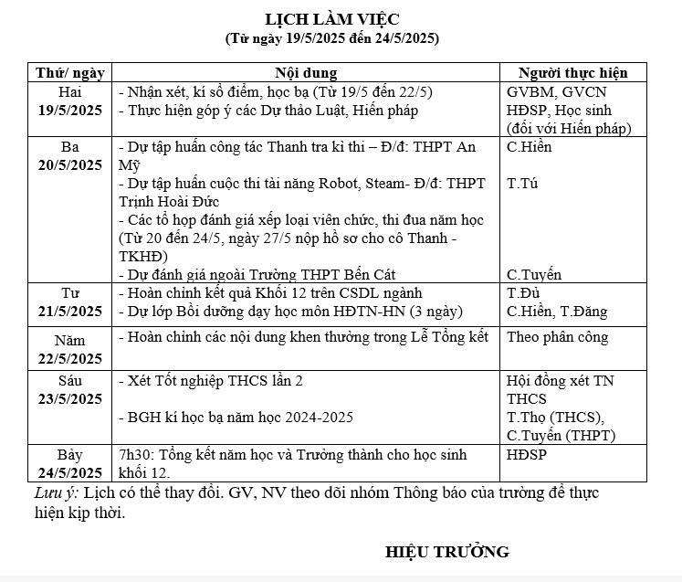 Lịch làm việc Tuần 37, từ ngày 19/5/2025 đến ngày 24/5/2025