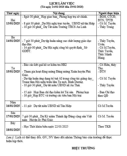 Ghi chú: Lịch làm việc Tuần 20, từ ngày 13/01/2025 đến ngày 18/01/2025