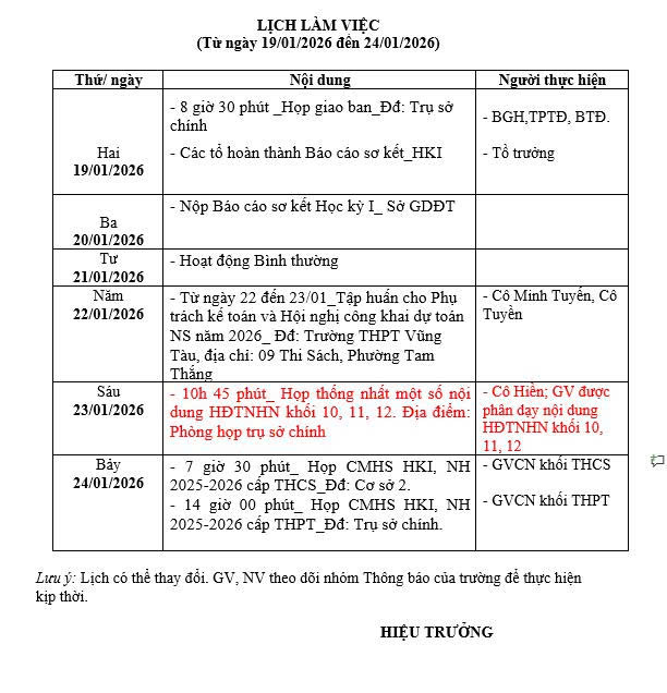 Ghi chú: Lịch làm việc Tuần 20, từ ngày 19/01/2026 đến ngày 24/01/2026