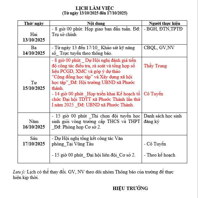 Ghi chú: Lịch làm việc Tuần 06, từ ngày 13/10/2025 đến ngày 17/10/2025