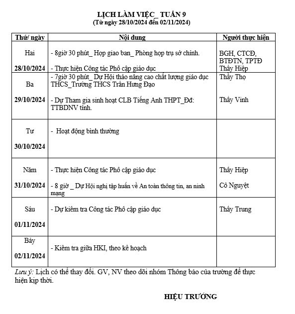 Ghi chú: Lịch làm việc tuần 9, từ ngày 28/10/2024 đến ngày 01/11/2024