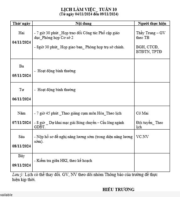 Ghi chú: Lịch làm việc tuần 10, từ ngày 04/11/2024 đến ngày 09/11/2024