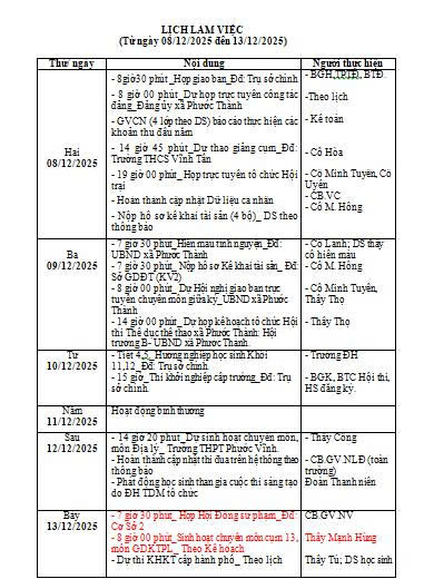 Lịch làm việc Tuần 14, từ ngày 08/12/2025 đến ngày 13/12/2025