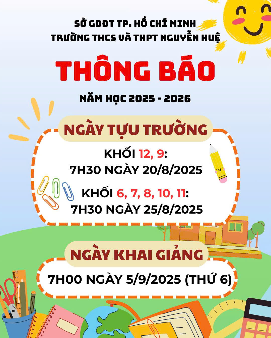 Học sinh tựu trường Khối 12, 9: 7h30 ngày 20/8/2025, Khối 6, 7, 8, 10, 11: 7h30 ngày 25/8/2025, NGÀY KHAI GIẢNG 7h00 ngày 5/9/2025 (Thứ 6)